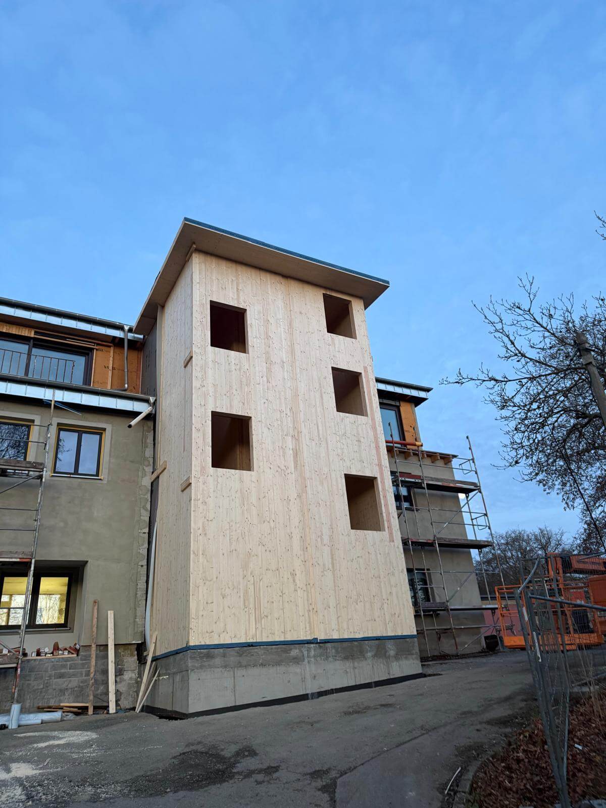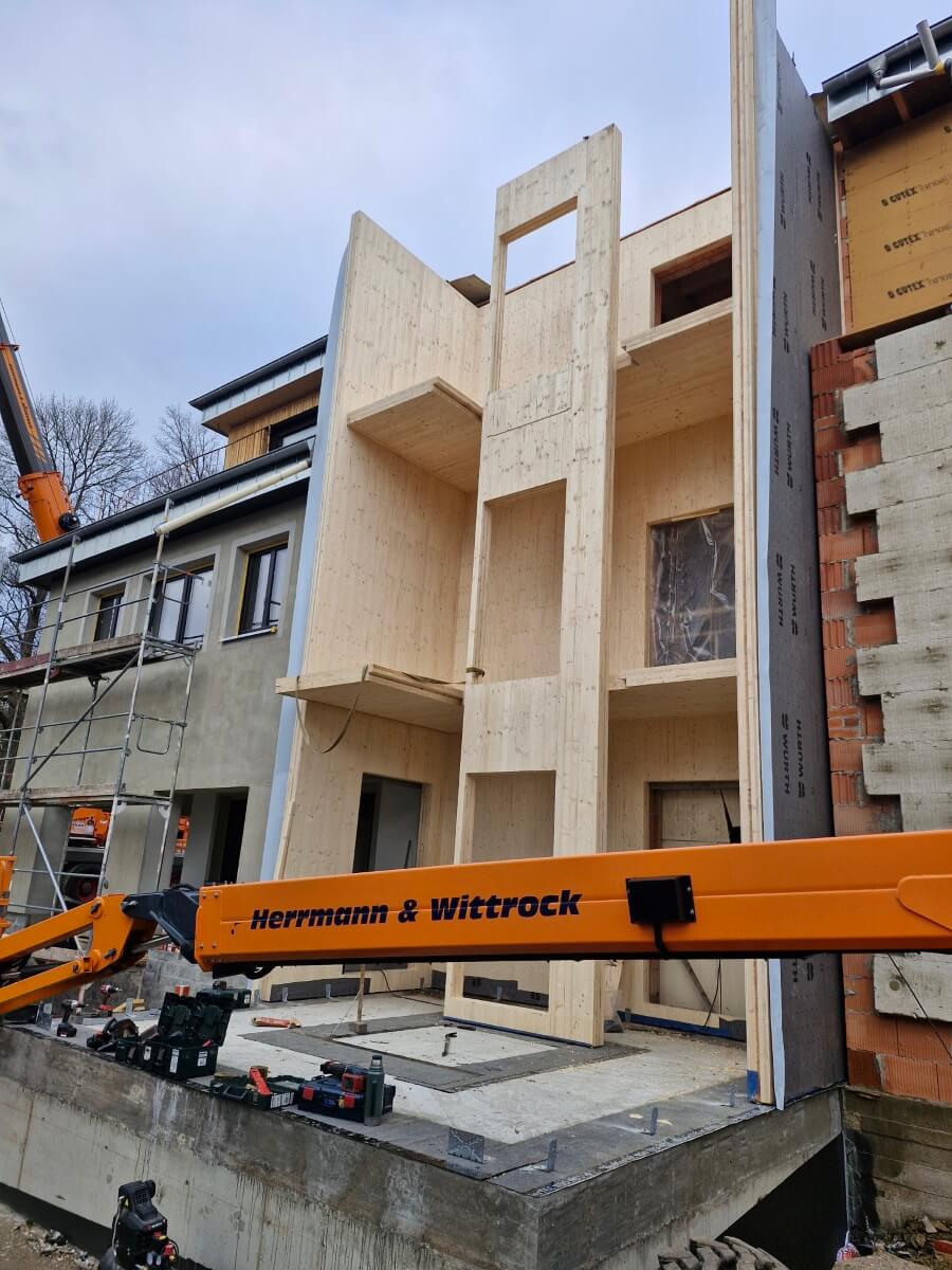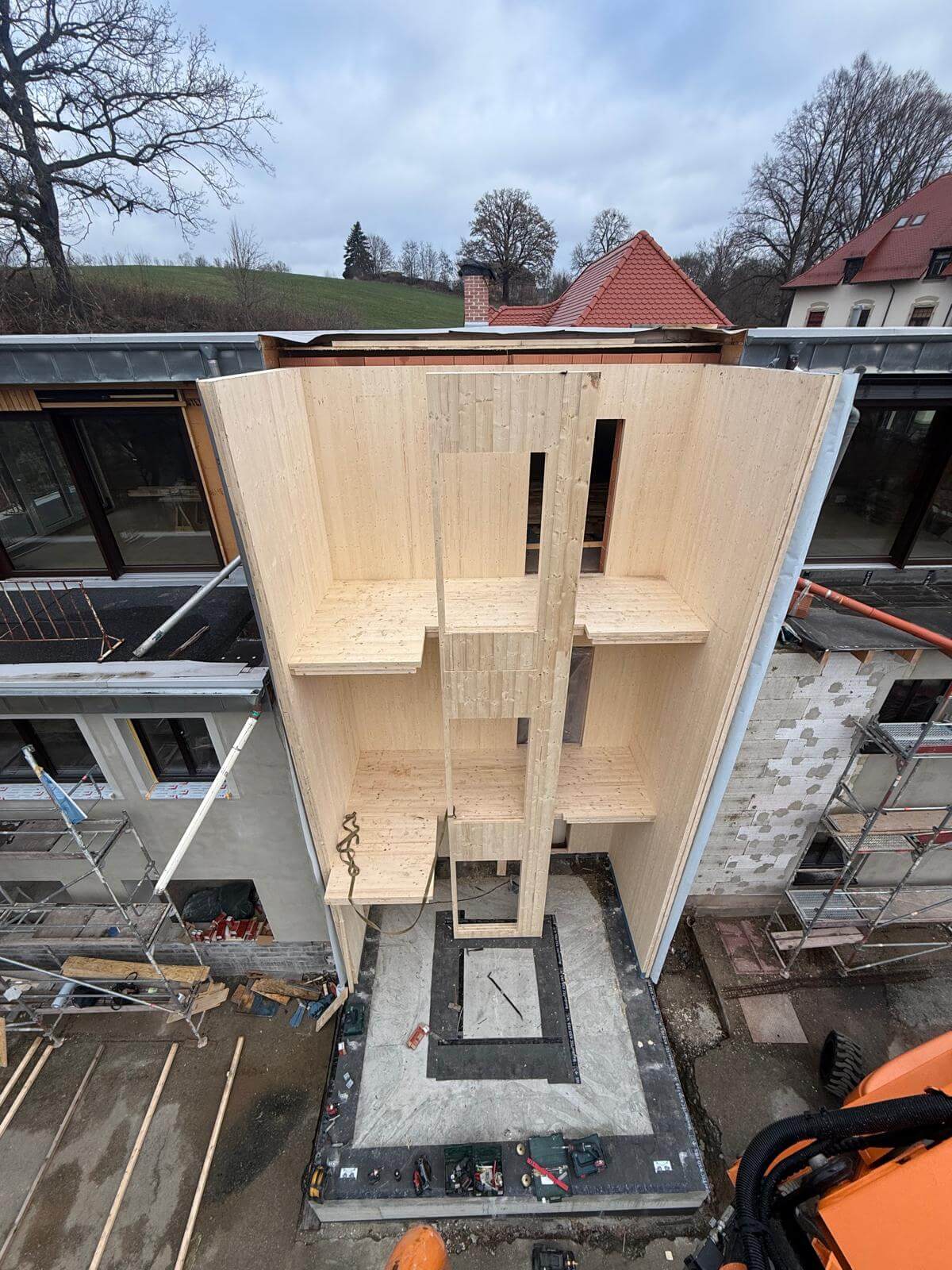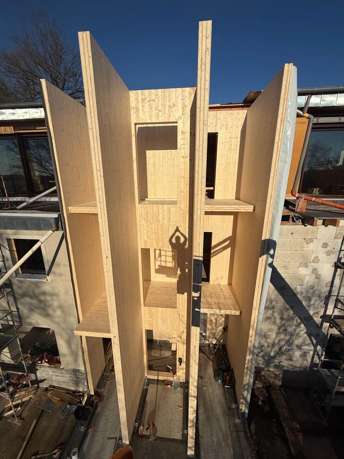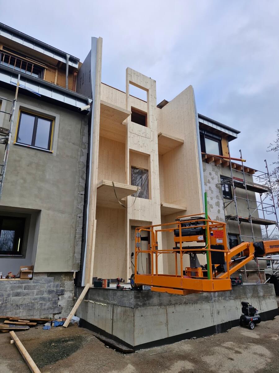 Neubau eines Treppenhauses mit Fahrstuhlschacht komplett aus ZIWO-BSP Massivholz gefertigt. Das Treppenhaus erststreckt sich über 3 Etagen.