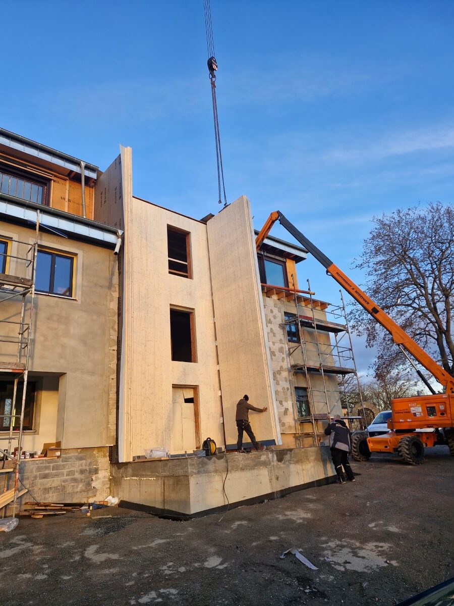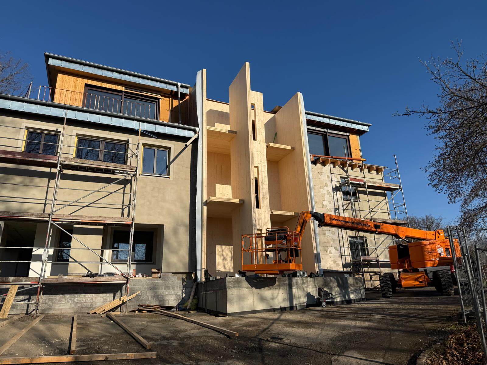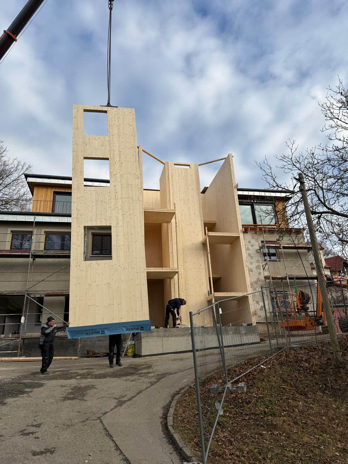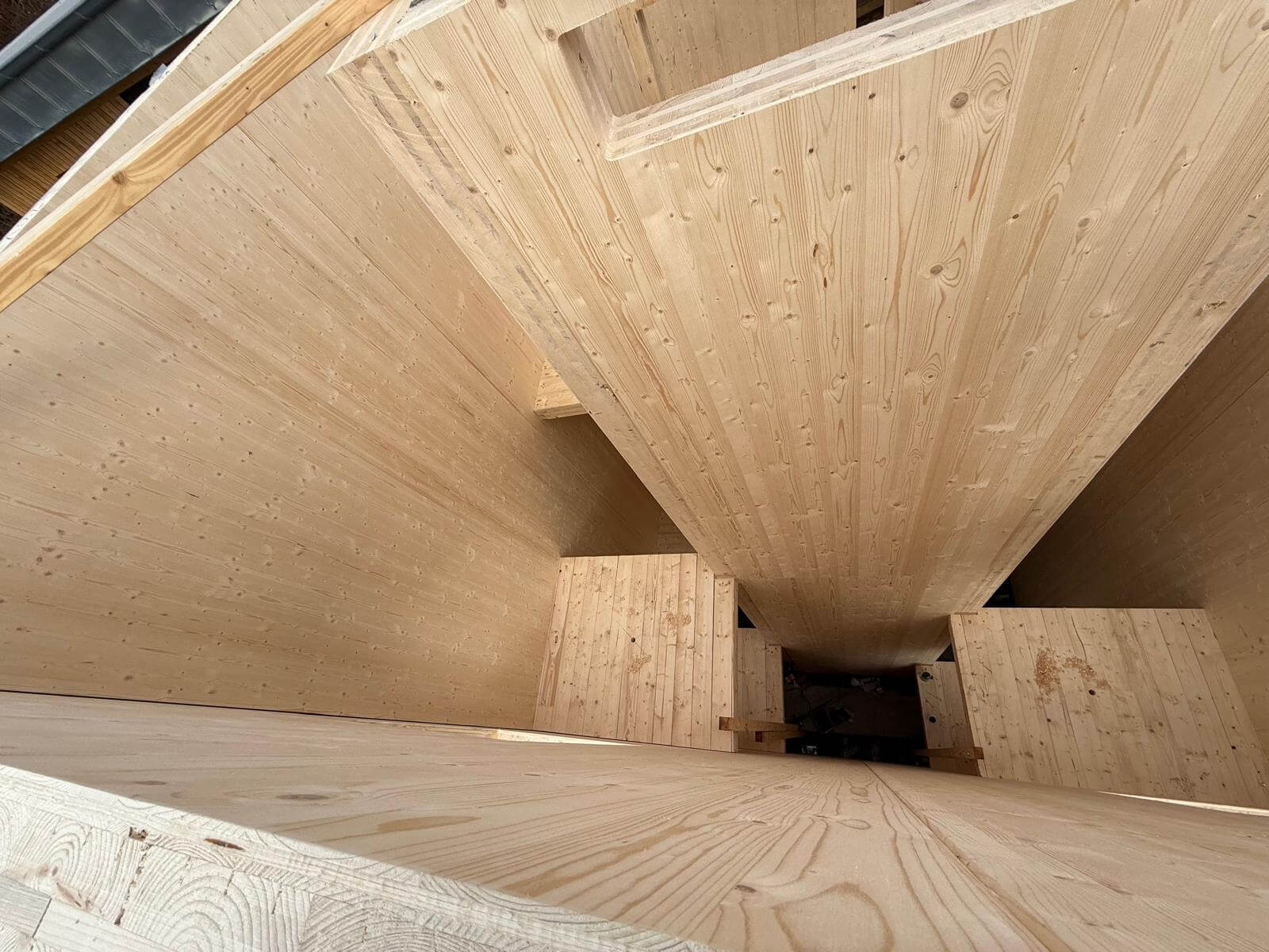 Neubau eines Treppenhauses mit Fahrstuhlschacht komplett aus ZIWO-BSP Massivholz gefertigt. Das Treppenhaus erststreckt sich über 3 Etagen.